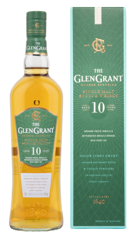 Der Glen Grant 10 Years Single Malt Whisky wird mit dem Wasser aus dem Spey-Fluss und der Gerste aus der Region Speyside hergestellt. Er wird in kupfernen Brennblasen destilliert und für 10 Jahre in Bourbonfässern gereift.